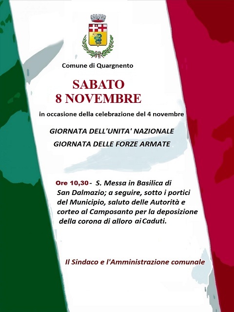 Si informa che per la celebrazione della giornata dell'Unità Nazionale e della giornata delle Forze Armate si terrà la S. Messa nella Basilica di San Dalmazio SABATO 8 NOVEMBRE 2025 alle ore 10:30; a seguire, il saluto delle Autorità sotto i portici del Municipio e il corteo verso il Camposanto per la deposizione della corona di alloro ai Caduti.